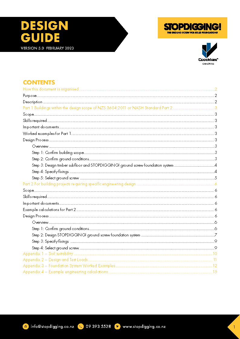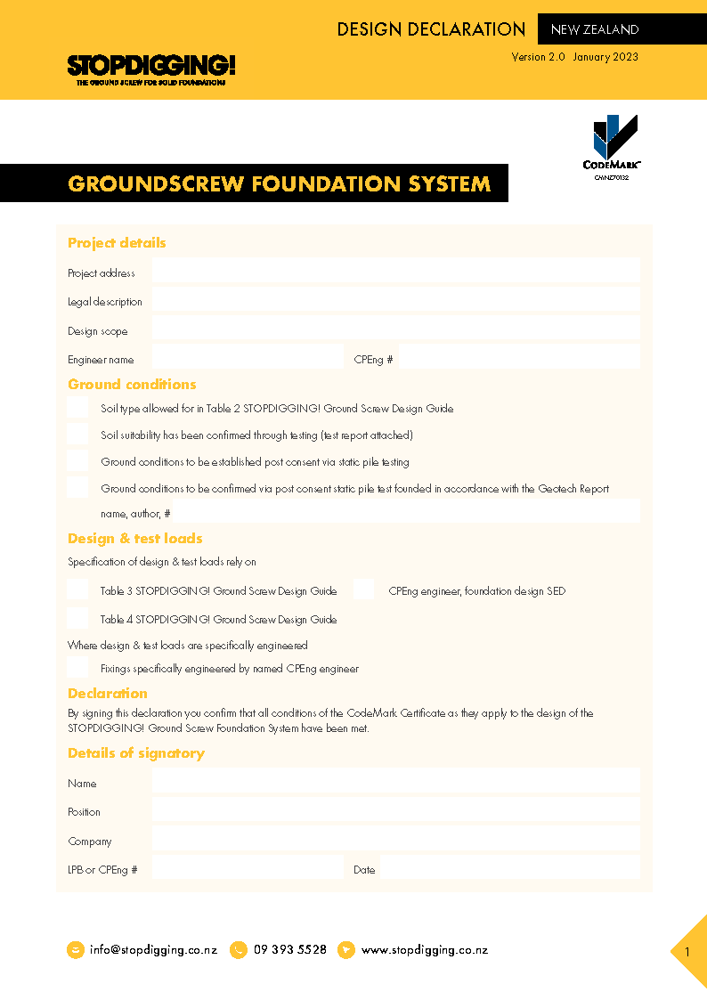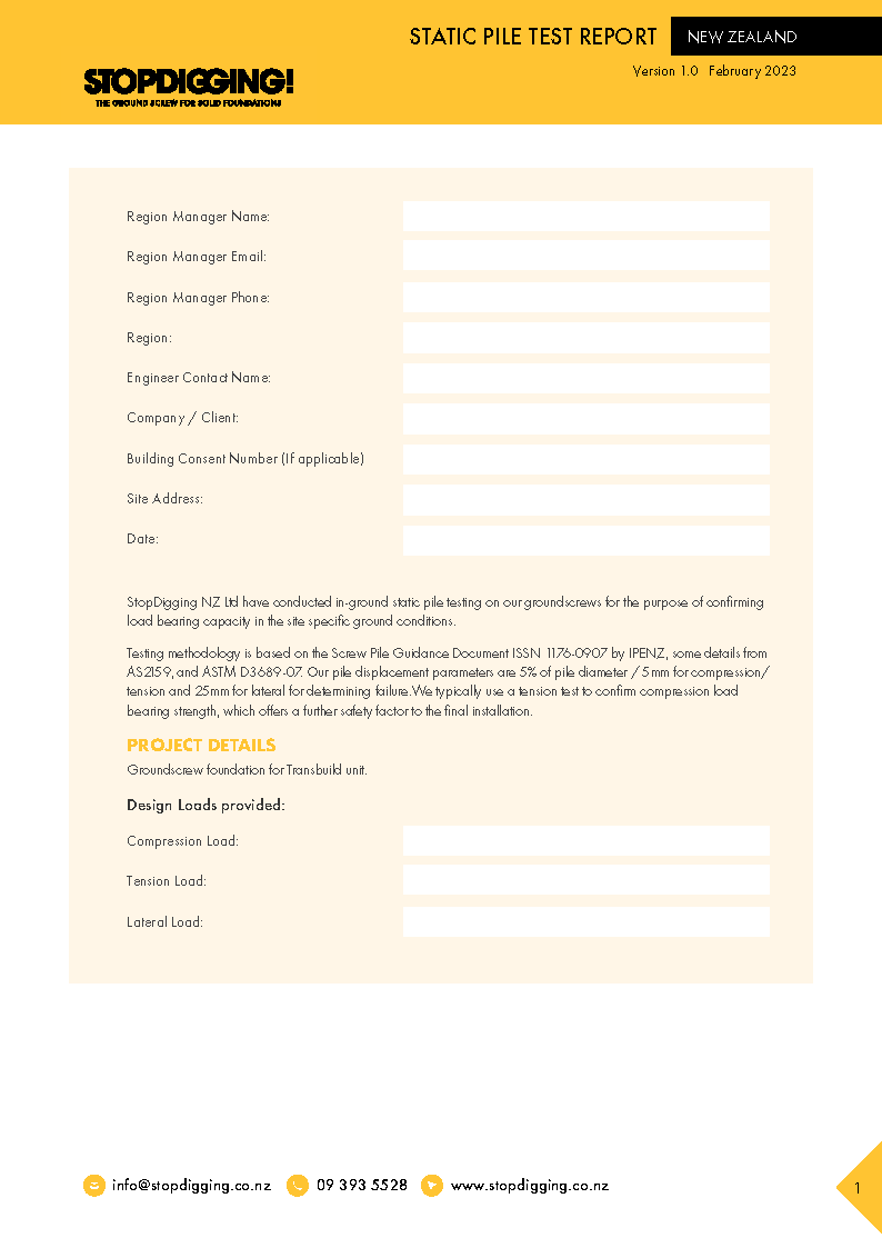 Stopdigging! NZ brings you the following Technical Documents. Please click on any document to view the full PDF. STOPDIGGING! Building Consent Requirement Nov 2022 STOPDIGGING! NZ Design Declaration v2.0 STOPDIGGING! NZ Design Guide v5.0 STOPDIGGGING! NZ Installation Guide v3.0 STOPDIGGING! NZ Installation Guide v3.0 STOPDIGGING! NZ Static Pile Test Report v1.0 STOPDIGGING! NZ Codemark Oct 2022